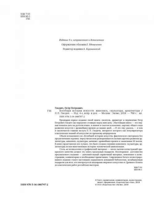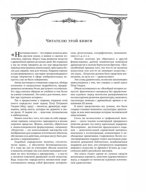 Искусство - одна из самых ярких форм материализации вечности. Строго говоря, созданное великими мастерами вообще не имеет цены - оно прекрасно, неповторимо и абсолютно случайно, будь это Венера Милосская, "Сикстинская Мадонна" Рафаэля или воздушные полотна французских импрессионистов. Книги, позволяющие оценить это богатство и получить достаточное представление о развитии искусства в целом, не углубляясь в подробности, более интересные специалистам, чем простым смертным, встречаются крайне редко. Поэтому популярность "Истории искусств" Петра Гнедича - явление феноменальное, хотя и вполне объяснимое. Еще недавно знатоки выкладывали немалые деньги за право обладать этим уникальным собранием изображений всего лучшего, что было создано гениями живописи, скульптуры, архитектуры за всю многовековую историю человеческой цивилизации. Современное богато иллюстрированное издание станет настоящим подарком для всех, кто интересуется шедеврами мирового искусства.