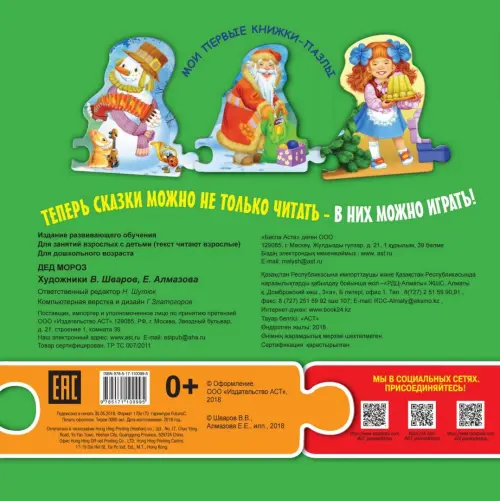 С героями самых известных классических стихов про дедушку Мороза и его помощницу Вьюгу Вьюговну можно поиграть. Пазлы из плотного мелованного картона удобно доставать из книжки и собирать в дорожку. Так будет еще проще запомнить стихи и интересно поиграть, составляя свои истории из пазлов. Ребенок всегда сам сможет вернуть пазл на правильное место в книге – ведь под пазлом изображение повторяется.