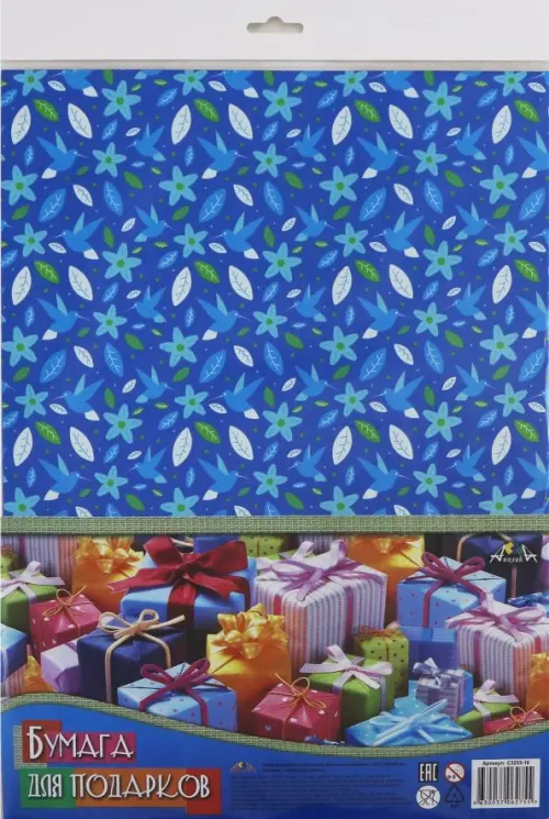 Цветная бумага для оформления подарков, размер листа 70х100 см. 1 лист. Внутренний блок - мелованная, глянцевая бумага, плотность 80 г/м?. Печать с одной стороны. В ассортименте 12 дизайнов. Бумага предназначена для упаковки подарков. Лист одного дизайна сложен в четыре раза. Упаковка - ПЭТ пакет с бумажным вкладышем и европодвесом.
