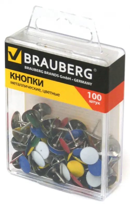 Кнопки канцелярские "Brauberg", металлические (цветные), 10 мм, 100 штук