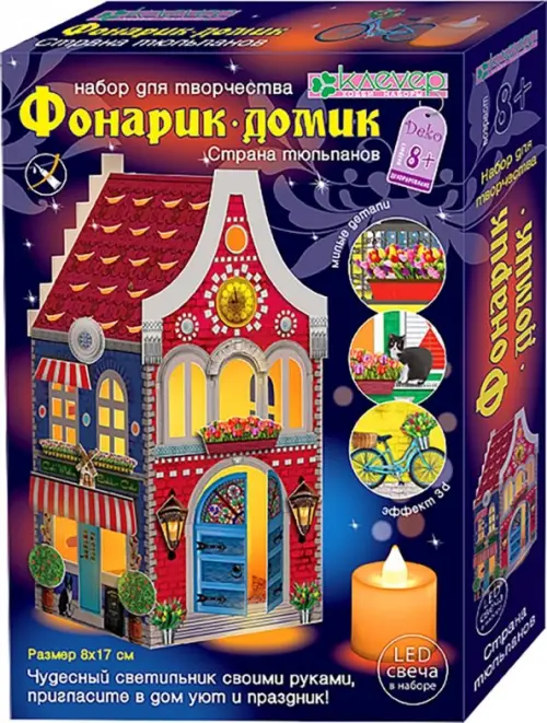 "Страна тюльпанов" - стильный голландский домик с характерными цветными стенами, узорной лепниной и изящными фонарями. А из 4-х домиков можно создать яркую красочную улицу в голландском стиле, выстроив домики в линию разными фасадами вперёд! Ребёнок старше 8 лет легко с помощью тонкого и объёмного скотча украсит готовыми вырубными деталями красочные фасады, соберёт основу фонарика-домика, включит и поставит внутрь LED-свечу. Окошки домика осветят мягким тёплым светом комнату и сделают ярким и запоминающимся праздничный вечер!