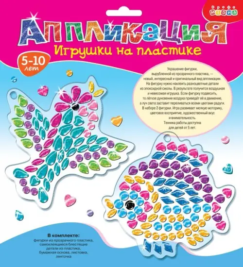 Новый, интересный и оригинальный вид аппликации. На прозрачную пластиковую фигурку нужно наклеить разноцветные блестящие детали. В результате получится невесомая, воздушная игрушка, которую легко подвесить с помощью ленточки.