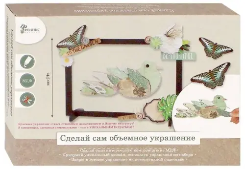 В наборе: детали из МДФ, декоративная бумага, листы из полипропилена, клей пва, кисточка из пвх, двусторонний скотч.