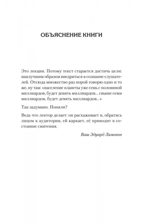 Лекции культового писателя и политического деятеля Эдуарда Лимонова внедряются в сознание слушателя и заставляют нас задуматься о социальном устройстве и культурных традициях, о нашем будущем и будущем нашей цивилизации. Тысячи беженцев колонизируют Европу, насаждая свою культуру, религию и правила. Нехватка пресной воды, перенаселение, исчерпавшие себя биоресурсы подводят нас к неминуемым войнам. Пропущенные через сознание писателя, изложенные ироничным стилем, мрачные пророчества никого не оставят равнодушными.