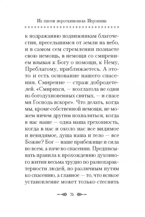 Предлагаемая читателю книга содержит фрагменты из духовного наследия иеросхимонаха Иеронима (в миру Иван Павлович Соломенцов; 1805–1885), касающиеся вопросов спасения мирских людей. Наставления и советы о. Иеронима, духовника Русского Свято-Пантелеимонова монастыря на Афоне, не потеряли значения и в настоящее время — это наши пособия на пути спасения. И как при жизни старца соприкасающиеся с ним люди изменялись, так и теперь его духовное наследие, примеры богоугодной жизни способствуют преображению души грешного человека.