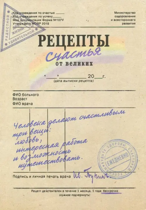Каждый лист ежедневника представляет собой рецепт счастья с подписью известного человека и личной печатью «врача».
