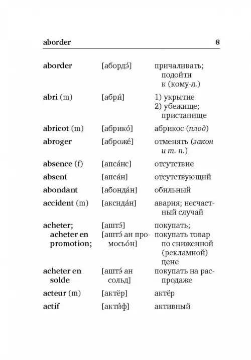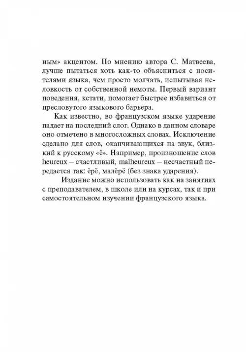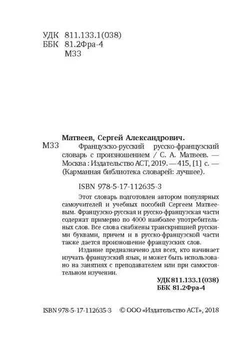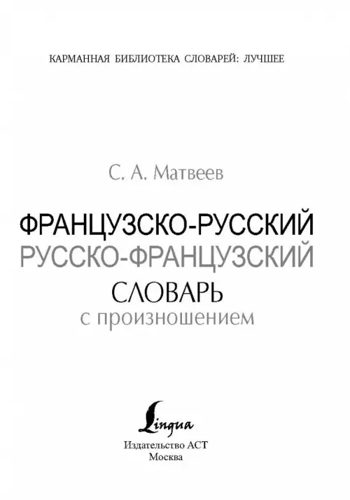Этот словарь подготовлен автором популярных самоучителей и учебных пособий Сергеем Матвеевым. Французско-русская и русско-французская части содержат примерно по 4000 наиболее употребительных слов. Все слова снабжены транскрипцией русскими буквами, причем и в русско-французской части также дается произношение французских слов.