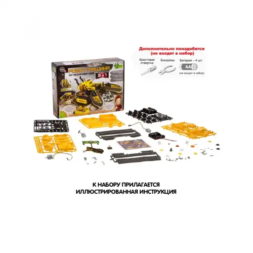 Робот-машина 3 в 1 - это многофункциональный робот на гусеничном ходу. Он управляется проводным пультом, что позволяет ему двигаться вперед и назад, поворачивать влево или вправо. Также вездеход ездит по разной местности и рельефу, погрузчик с вилочным захватом поднимает платформу и робот с механическим захватом берет предметы. Собирая робота, дети учатся логически мыслить, работать с инструкциями получают новые знания в области электроники. А когда многофункциональный робот будет собран, получат массу удовольствия от игры с ним!