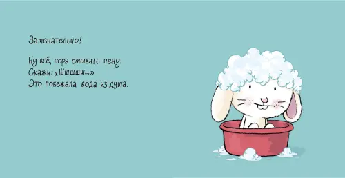 Это книга-игра, которая познакомит малыша с таким ежедневным ритуалом, как купание, и сделает его приятным и интересным. Ребенку предстоит помочь главному герою, милому зайчонку, набрать воды, намылить шерстку шампунем, смыть пену водой и вытереться полотенцем.