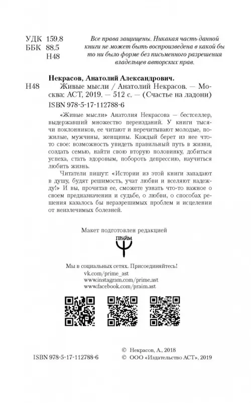 «Живые мысли» Анатолия Некрасова – бестселлер, выдержавший множество переизданий. У книги тысячи поклонников, ее читают и перечитывают молодые, пожилые, мужчины, женщины. Каждый берет из нее что-то свое: возможность увидеть правильный путь в жизни, создать семью, найти свою вторую половинку, добиться успеха, стать здоровым, побороть депрессию, научиться любить жизнь.