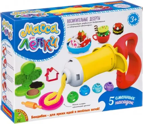 Состав набора: пресс-машина, 5 насадок, 6 формочек, масса для лепки (8 штук).