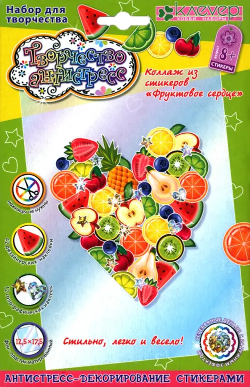 Набор "Фруктовое сердце" поможет сделать коллаж из узорных стикеров-фруктиков и блестящих стикеров: ребёнок старше 8 лет наклеит их на матированный полупрозрачный пластик и создаст оригинальную картинку. Или можно украсить фруктовым сердцем тетрадь, пенал, ноутбук или планшет, зеркало, окно, холодильник или дверь детской комнаты.
