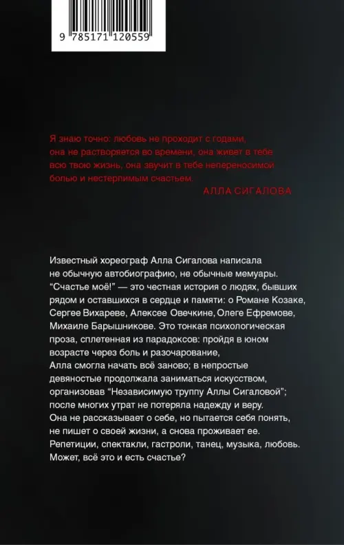 Известный хореограф Алла Сигалова написала не обычную автобиографию, не обычные мемуары. “Счастье моё!” — это честная история о людях, бывших рядом и оставшихся в сердце и памяти: о Романе Козаке, Сергее Вихареве, Алексее Овечкине, Олеге Ефремове, Михаиле Барышникове. Это тонкая психологическая проза, сплетенная из парадоксов: пройдя в юном возрасте через боль и разочарование, Алла смогла начать всё заново; в непростые девяностые продолжала заниматься искусством, организовав “Независимую труппу Аллы Сигаловой”; после многих утрат не потеряла надежду и веру.