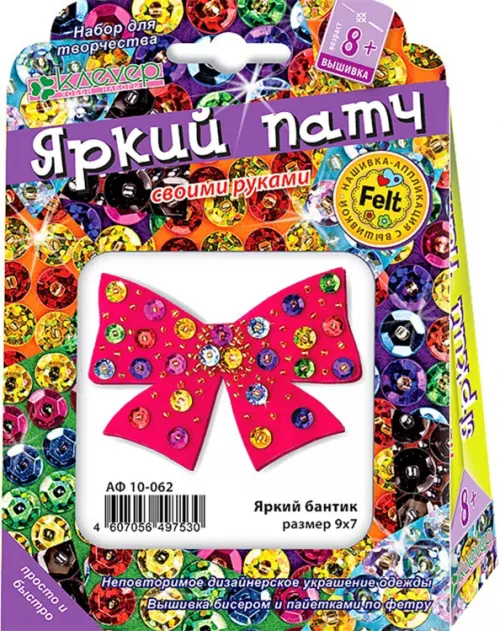 Уже готовая фигурка! Вырезать не нужно! Яркий патч - модный акцент для одежды и сумок, украшение-нашивка на мягком фетре. Рукодельница старше 8 лет легко нашьёт блестящие нити с бисером на фетр, добавит яркие пайетки! Результатом увлекательного творчества с набором станет переливающееся и стильное украшение - розовый бантик.