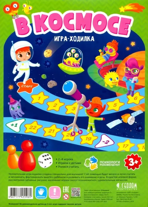 Игра-ходилка с фишками “В космосе” - настоящая находка для всех любознательных малышей. С этой развивающей настольной игрой ребенок сможет выучить основы счета, познакомиться с командными играми и совершить первый космический полет. Яркие, красочные персонажи станут друзьями ребенка на пути к финишу и будут помогать ему в течении всей игры. Игра подходит даже для самых маленьких, развивает память, мелкую моторику и кругозор.