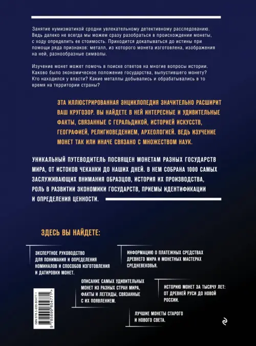 История всего мира - в истории 1000 самых уникальных и знаменитых монет! Эта книга станет прекрасным подарком не только начинающим нумизматам, но и людям, интересующимся увлекательной историей монет и историей разных стран и континентов. В ней рассказывается о форме государственной власти, о степени развития промышленности и техники в стране, выпустившей монету, о династических проблемах и особенностях геральдики. Благодаря этой книге, вы познакомитесь с шедеврами монетного искусства древнего мира, с лучшими европейскими монетами нового времени, с денежной системой СССР и России, с уникальными монетами Австралии, Океании, государств Азии и многих других стран.