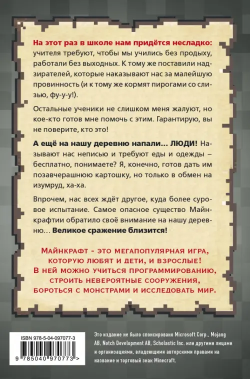 Третья книга приключений в мире "Майнкрафт", самой популярной игры последних лет. Цветные и забавные иллюстрации в стиле игры, формат дневника - то, что нужно для погружения в мир Минуса, обыкновенного мальчика, жителя Майнкрафтии.