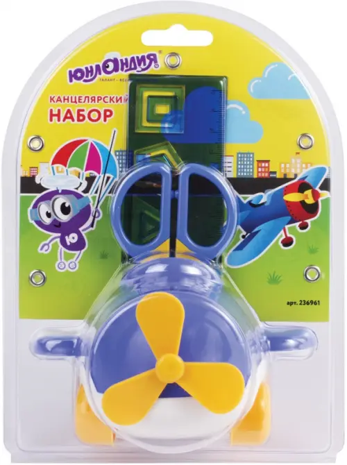 Состав набора: подставка в форме самолета; пластиковые ножницы с безопасными закругленными лезвиями; линейка с трафаретами; стирательная резинка.