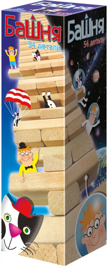 "Башня", известная в мире под разными названиями, — "Дженга", "Вавилон", "Городок", "Пизанская башня" — популярная и увлекательная игра для любой компании. В неё до сих пор с интересом играют люди разных возрастов — и дети, и взрослые. Цель игры — аккуратно вынуть деревянный брусок из башни и положить его сверху, не разрушив при этом всю конструкцию. Кажется, это просто. Только вот руками башню придерживать нельзя. Игроки действуют одной рукой на свой страх и риск, постройка опасно раскачивается, градус напряжения нарастает — кто же разрушит башню? Количество игроков не ограничено, но при желании можно и одному сыграть, скучно точно не будет!