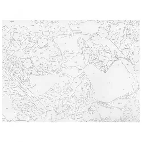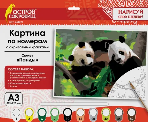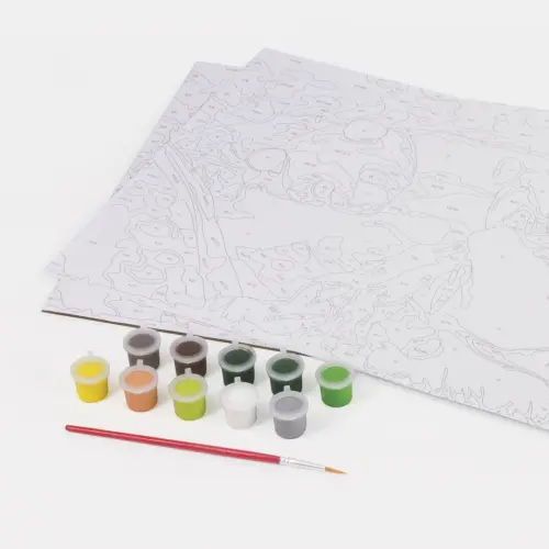 Состав набора: 1 картонная основа с контуром, пронумерованная в соответствии с номерами красок, 1 лист бумаги для тренировки, акриловые краски и кисть.