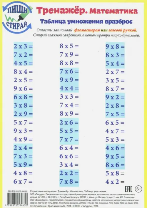 Если вы обнаружили ошибку в описании товара «Математика. Таблица умножения. Тренажер, А5», то выделите её мышкой и нажмите Ctrl+Enter. Спасибо, что помогаете нам стать лучше!