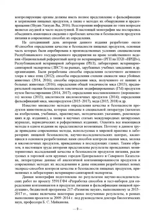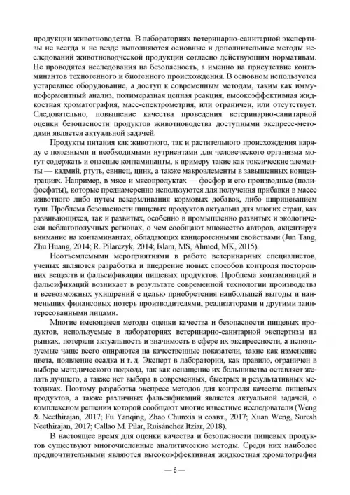 В издании рассматриваются вопросы качества и безопасности продуктов питания, наиболее распространенные контаминанты и виды фальсификаций, методики их обнаружения, отраженные за последние годы в публикациях, входящих в международные базы. Также приведены новые, разработанные авторами экспресс-способы контроля качества и безопасности продуктов животноводства — мяса, молока и мясомолочных продуктов, применимые при проведении ветеринарно-санитарной экспертизы.