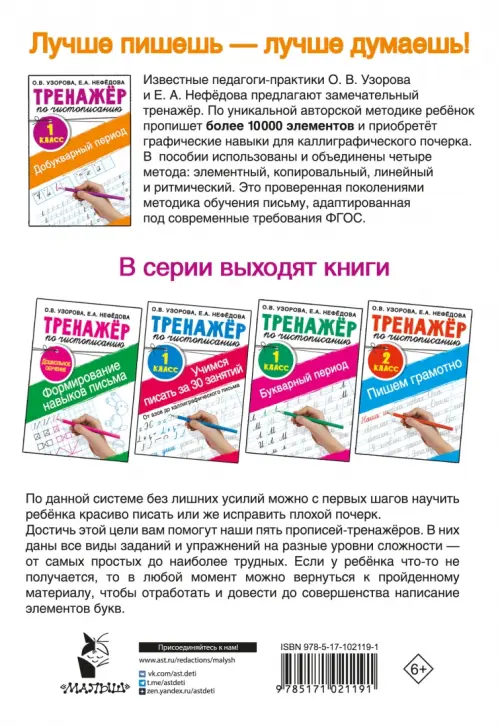 Ольга Узорова: «Интернет не научит детей мыслить»Если вы обнаружили ошибку в описании товара «Тренажер по чистописанию. 1 класс. Добукварный период» (авторы: Нефёдова Елена Алексеевна, Узорова Ольга Васильевна), то выделите её мышкой и нажмите Ctrl+Enter. Спасибо, что помогаете нам стать лучше!