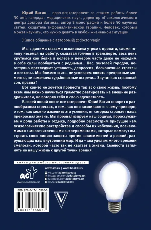 Юрий Вагин – врач-психотерапевт со стажем работы более 30 лет, кандидат медицинских наук, директор "Психологического центра доктора Вагина", автор 8 монографий и более 50 научных статей, создатель тифоаналитической терапии. Человек, который может научить, что нужно делать в любой жизненной ситуации. Мы с дикими глазами вскакиваем утром с кровати, сломя голову несемся на работу, создавая толчею в транспорте, весь день крутимся как белка в колесе и вечером часто даже не находим в себе силы пообщаться с родными… Нас, жителей городов, неотступно преследуют усталость, депрессия, бесконечные стрессы и психозы. Мы боимся жить, не успеваем ловить прекрасные моменты, не замечаем судьбоносные встречи… Звучит как страшный сон, правда? Вот как-то не хочется провести так всю свою жизнь, поэтому всем нам важно научиться грамотно реагировать на внешние раздражители, не потеряв себя и свою адекватность. В своей новой книге психотерапевт Юрий Вагин говорит о разнообразных стрессах, о том, как они возникают и к чему приводят, о том, как можно изменить эти условия, от которых страдает наша прекрасная жизнь. Мы проанализируем наш социум, порассуждаем о роли работы и отдыха, подробно рассмотрим присущие нам психологические расстройства и способы их избежания, познакомимся с многочисленными экспериментами, которые помогут выстроить свою линию защиты против зависимостей и реалий, разрушающих наш внутренний мир. И да – мы уделим много времени смелости, которой часто так не хватает в жизни. Смелости взглянуть на нашу жизнь с другой точки зрения.