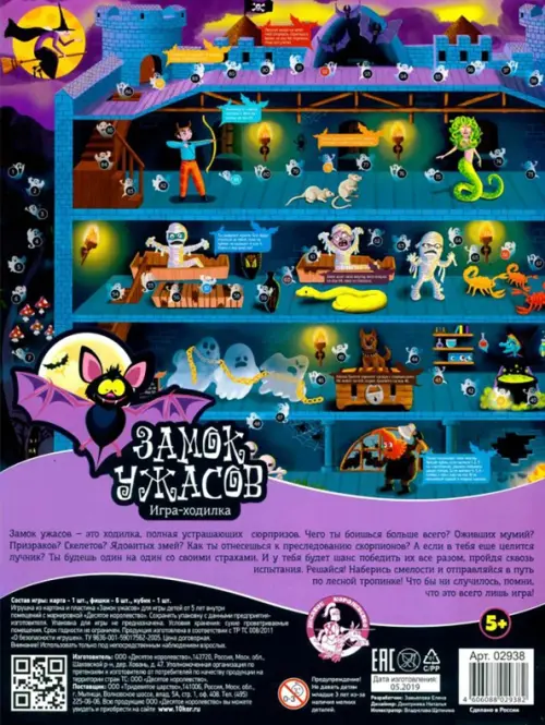 Игра "Замок ужасов" - это ходилка, полная устрашающих сюрпризов. Чего ты боишься больше всего? Оживших мумий, призраков, скелетов или, может, ядовитых змей? Встреться один на один со своими страхами и победи их все разом, пройдя испытания. Наберись смелости и отправляйся в путь по лесной тропинке. Что бы ни случилось - помни, что это всего лишь игра! Состав: - игровое поле - 59 х 44,5 см - фишки - 6 шт. - кубик - 1 шт. Сражайтесь с пиратами в поисках сокровищ, изучайте космос и мир Юрского периода, отправляйтесь во времена первых людей, погружайтесь на морское дно, спасите Королеву фей или устройте кругосветное путешествие с другими настольными играми серии. Материалы: картон, бумага, полимерный материал. Внимание! Не предназначено для детей младше 3-х лет. Для детей от 5 лет.