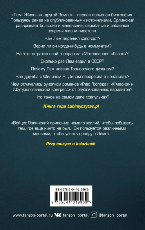 "Лем. Жизнь на другой Земле" - первая польская биография. Пользуясь ранее неопубликованными источниками, Орлинский расрывает большие и маленькие, серьезные и забавные секреты жизни писателя. Как Лем пережил Холокост? Верил ли он когда-нибудь в коммунизм? На что потратил свой гонорар за "Магелланово облако"? Сколько раз Лем ездил в СССР?
