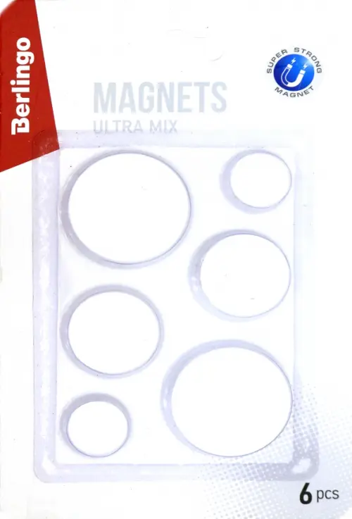 Набор состоит из 6 магнитов разного диаметра: 20 мм - 2 штуки, 30 мм - 2 штуки, 40 мм - 2 штуки.