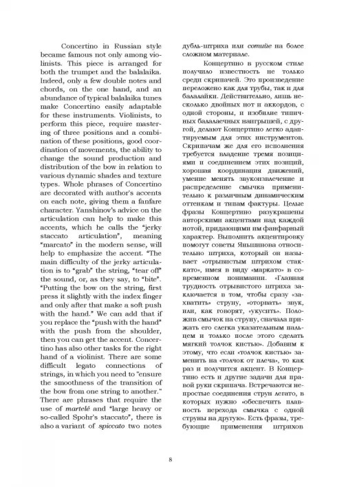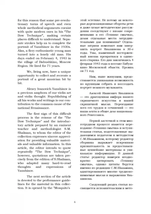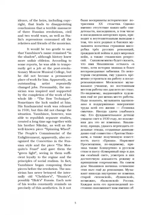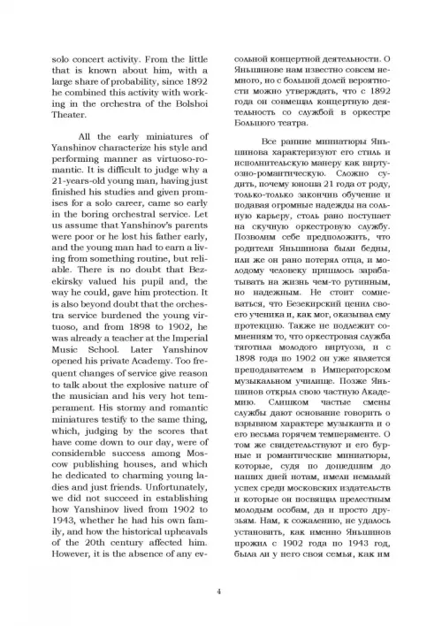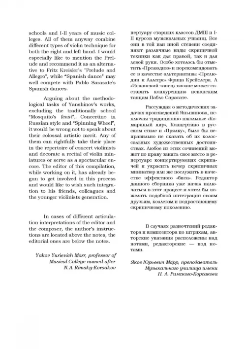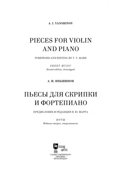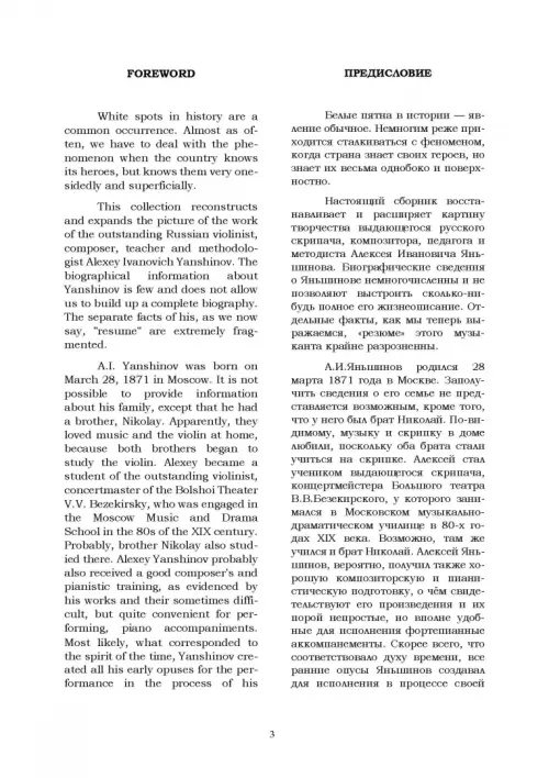 Алексей Иванович Яньшинов (1871–1943) — видный российский скрипач, педагог, композитор, творчество которого почти ушло из практики современных исполнителей. Однако некоторые его сочинения (пьеса «Прялка» ор. 26 и Концертино ор. 33) стали важной частью учебного репертуара в программе ДМШ и ДШИ. Настоящий сборник предлагает вниманию музыкантов девять пьес композитора, обладающих несомненными художественными достоинствами.
