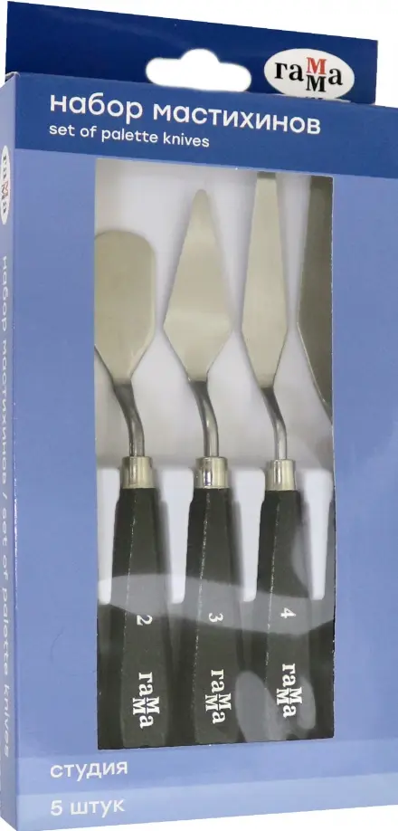 5 мастихинов в наборе для профессиональных художников. Предназначены для художественных работ масляными и акриловыми красками. Выполнены из нержавеющей стали, кованные, с ручкой из натурального дерева. Удобная коробка для хранения. Вид товара: набор мастихинов.