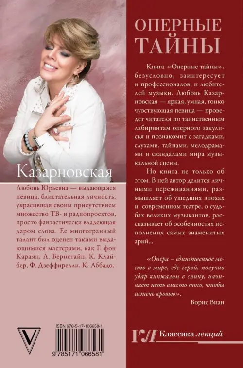 Книга «Оперные тайны», безусловно, заинтересует и профессионалов, и любителей музыки. Любовь Казарновская – яркая, умная, тонко чувствующая певица – проведет читателя по таинственным лабиринтам оперного закулисья и познакомит с загадками, слухами, тайнами, мелодрамами и скандалами мира музыкальной сцены.