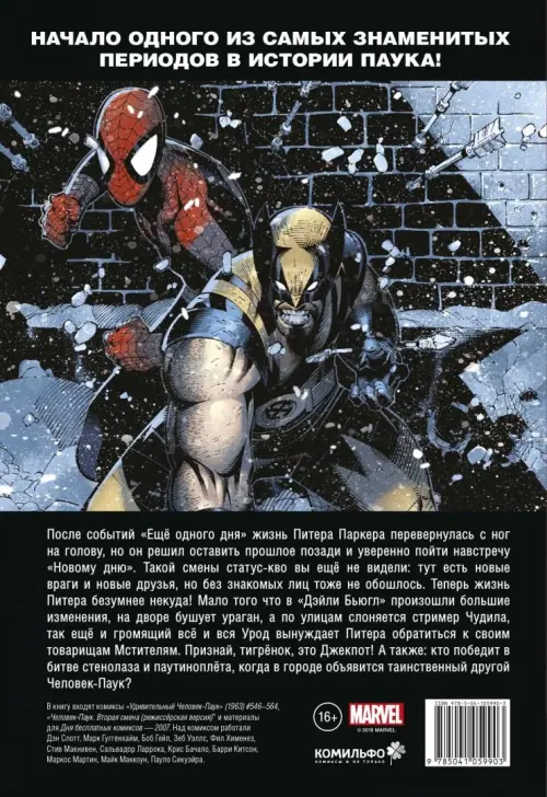 После событий "Ещё одного дня" жизнь Питера Паркера перевернулась с ног на голову, но он решил оставить прошлое позади и уверенно пойти навстречу "Новому дню". Такой смены статус-кво вы ещё не видели: тут есть новые враги и новые друзья, но без знакомых лиц тоже не обошлось. Теперь жизнь Питера безумнее некуда! Мало того что в "Дэйли Бьюгл" произошли большие изменения, на дворе бушует ураган, а по улицам слоняется стример Чудила, так ещё и громящий всё и вся Урод вынуждает Питера обратиться к своим товарищам Мстителям. Признай, тигрёнок, это Джекпот! А также: кто победит в битве стенолаза и паутиноплёта, когда в городе объявится таинственный другой Человек-Паук?