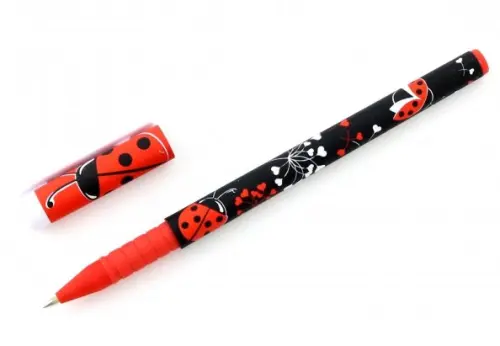 Ручка с забавным принтом в виде божьих коровок и сердечек, Яркая и приятная на ощупь. Кончик прорезиненный. Покрытие софт тач, приятно лежит в руке и не скользит. Сделана аккуратно. Колпачок плотно держится, до щелчка. Ручка синяя, пишет хорошо и тонко, не засыхает и не заедает. Мне нравится эта серия ручек, брала уже несколько себе и на небольшие...