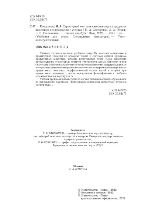 Допущено ФУМО в системе высшего образования по укрупненной группе специальностей и направлений подготовки «Ветеринария и зоотехния» в качестве учебника для межвузовского использования в учебных организациях, реализующих программы высшего образования по специальности «Ветеринария» и направлениям подготовки «Ветеринарно-санитарная экспертиза» (бакалавриат), «Ветеринарно-санитарная экспертиза» (магистратура).