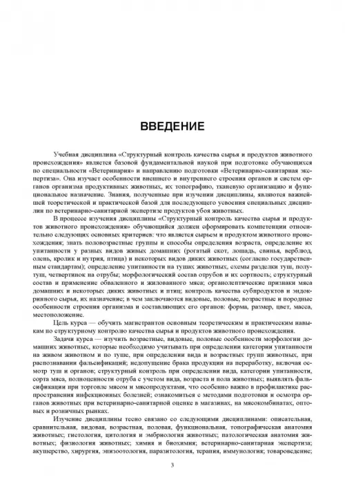 Учебник составлен согласно учебному плану. Он включает лекционные и практические сведения об основных тканях и системах органов организма продуктивных животных, которые представляют собой сырьё животного происхождения; структурный контроль упитанности живых животных и туш (полутуш) продуктивных животных согласно государственным стандартам; видовые и возрастные анатомические различия соматических и внутренних систем организма продуктивных животных; морфологический состав частей и отрубов туш продуктивных животных с целью недопущения фальсификаций и особенно зооантропонозов в торговую сеть.