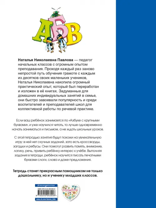 С этой тетрадью занятия будут похожи на увлекательную игру: в ней нет скучных заданий, зато есть кроссворды, загадки и ребусы. Они помогут развить память, внимание, логику, речь, привить ребенку интерес к учёбе. Выполняя задания в тетради ребёнок научится писать печатными буквами слоги, слова и даже предложения.