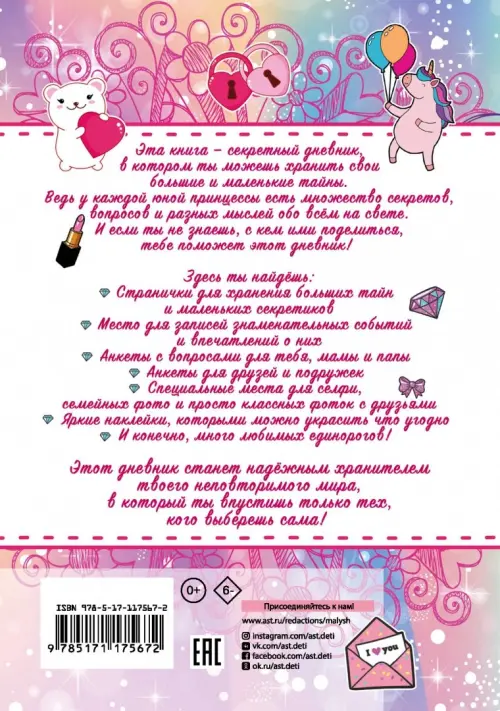 У каждой девочки есть секреты (и совсем маленькие секретики), из которых складывается её неповторимый мир. Школа, увлечения, общение с мамой и папой, братьями и сёстрами, друзьями и подружками, домашними питомцами... И всё это вызывает целую палитру чувств и оригинальные мысли обо всём на свете! Эта красочная книга тоже с секретом. Точнее, она сама - секрет. Ты держишь в руках дневник, в который можно поместить все свои тайны и хранить их, никому не показывая. Или дать почитать избранные места тем, кому пожелаешь. А еще ты можешь ответить на вопросы анкеты о себе, своих родных и близких... Вот увидишь: пройдёт какое-то время, и не только тебе, но и им будет интересно вспомнить, каким он был - яркий и цветной мир, навсегда запечатленный на страничках твоего дневника. Для дошкольного возраста.