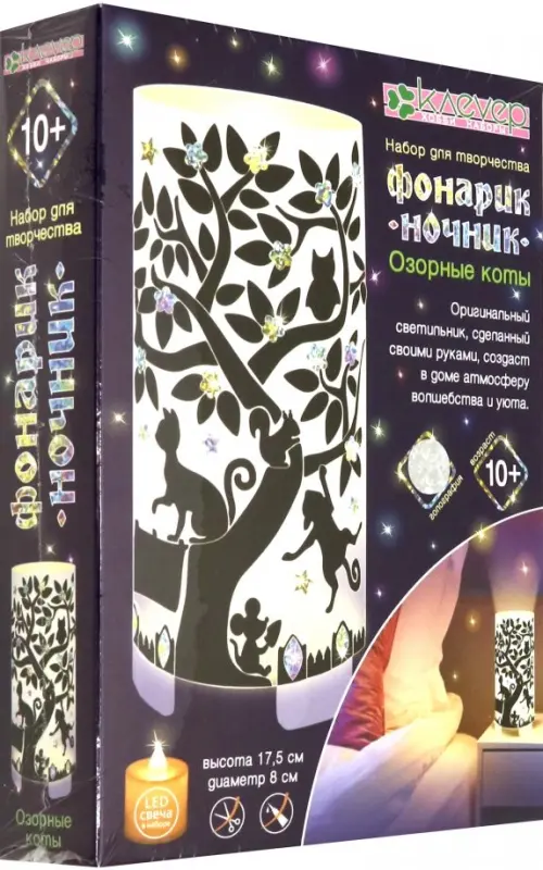Фонарик-ночник "Озорные коты" - это hand-made светильник с фантазийным сюжетом о любимых всеми котиках. Уникальность набора "Озорные коты" - в сочетании увлекательного процесса и оригинального результата - предмета интерьера. Как взрослому, так и ребёнку старше 10 лет будет интересно изготовить фонарик. Работу сделают приятной её простота - наклеить стикеры по схеме и интересные материалы - матированный пластик, плёнка-самоклейка, голографические стикеры и скотч вместо клея. Дополнительно ребёнок освоит навыки работы с виниловой плёнкой.