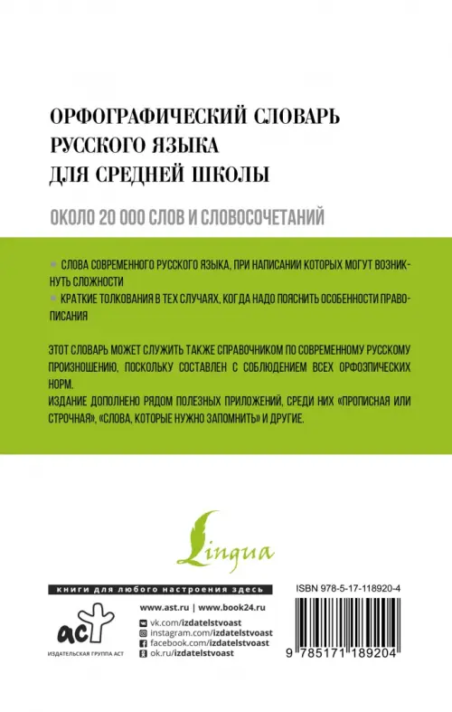 Данный словарь содержит около 20 000 слов и словосочетаний. В него вошли слова современного русского языка, при написании которых могут возникнуть сложности. В тех случаях, когда надо пояснить особенности правописания, даются краткие толкования. Словарь может также служить справочником по русскому произношению, так как составлен с соблюдением всех орфоэпических норм. Издание дополнено полезными приложениями: "Прописная или строчная", "Слова, которые нужно запомнить (словарные слова)", "Мужские имена, отчества", "Женские имена" и "Города России и названия их жителей". Словарь адресован учащимся средней школы. Однако он может быть полезен также студентам и всем, кто хочет грамотно писать по-русски.
