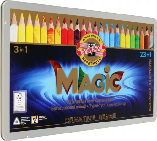 Цветные карандаши "Magic" отличаются от других карандашей своим грифелем. Грифель этих карандашей многоцветный. Карандаши «Magic» пользуются популярностью у художников и детей по всему миру. Представлены в наборах, упакованы в металлическую коробку.