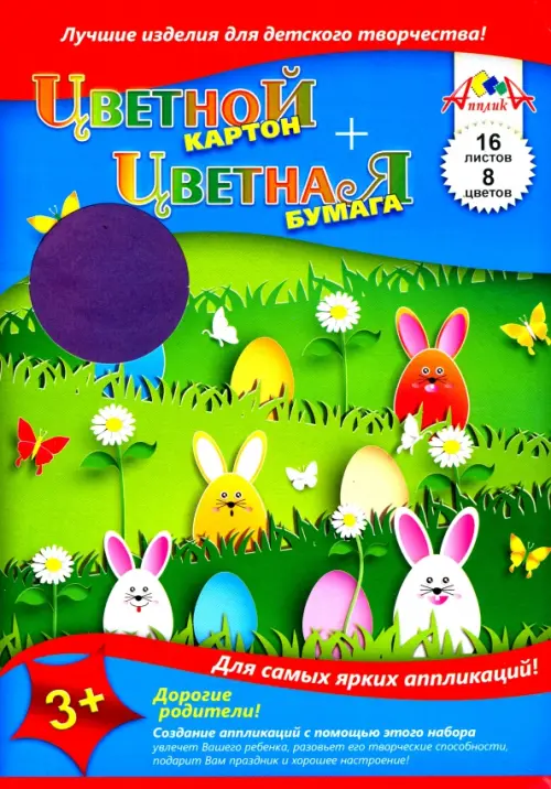 Цветной картон, 16 листов, 8 цветов и цветная бумага, 16 листов, 8 цветов, формат А4, плотность картона 200 г/м?, плотность бумаги 65 г/м?. Внутренний блок - немелованный картон и офсетная бумага. В наборе цвета картона: красный, синий, зеленый, желтый, оранжевый, фиолетовый, черный, белый. Цвета бумаги: фиолетовый, оранжевый, красный, синий, зеленый, коричневый, черный, желтый. Упаковка - папка из мелованного картона с одним клапаном. Рекомендуется детям до 3-х лет.