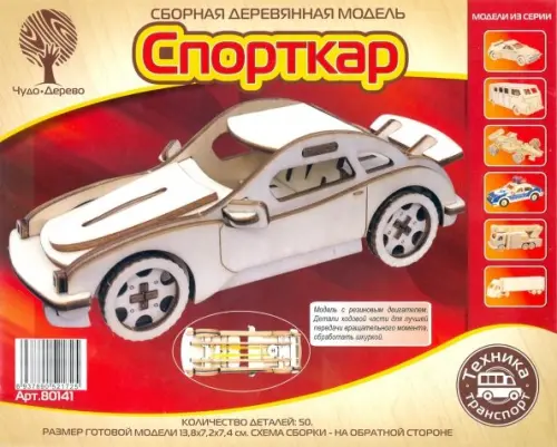 Сборная деревянная модель. Спорткар 1 с резиновым двигателем