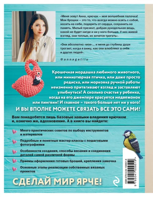 Крошечный единорог на джинсовой куртке, яркая синичка на рюкзачке, очаровательный корги на детском джемпере! А может быть, лось, пингвины, ленивец или даже выдры? Какое животное вам ближе по духу? Каждый невольно улыбнется, а потом удивится тому, что эти очаровательные брошки ручной работы связаны крючком. Популярный автор и блогер Анна Гатыло представляет технику вязания миниатюрных брошек, которые не оставят равнодушными никого! Очаровательные авторские проекты представлены в виде подробных и понятных мастер-классов, чтобы их воплотить, достаточно минимальных навыков владения крючком. И вы станете обладателем уникальных украшений, сделанных своими руками, и сможете сделать друзьям и близким индивидуальный подарок, созданный специально для каждого из них! Успехов вам в творчестве!