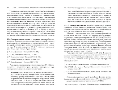 Монография посвящена генезису человеческого мышления и языка — образованию у человека (ребенка) понятий, пропозиций и речи. В первой главе дан аналитический обзор основных понятий эволюционно-синтетического подхода к изучению человека, его деятельности, мышления и языка. Введена дихотомия: «визуальные (экзогенные) vs. функциональные (эндогенные)» когнитивные единицы. Показывается, что из них посредством бинарных отношений строятся ментальные репрезентации различных объектов (стакан, банан, дерево, озеро), действий (бежать, сидеть) и ситуаций. Вторая глава посвящена анализу процесса образования у ребенка простых человеческих понятий, пропозиций — предикативных выражений, составленных из этих понятий, — и двусоставных предложений. Показывается, что у младенца элементарными единицами представления мира являются синкретичные ментальные репрезентации агентивных ситуаций. Эти допонятийные «синкреты» в процессе двухэтапного когнитивного развития ребенка трансформируются в понятия и пропозиции.
