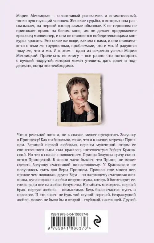Что в реальной жизни, не в сказке может превратить Золушку в Принцессу? Как ни банально, то же, что и в сказке: встреча с Принцем. Вера росла любимой внучкой и дочкой. В их старом доме в Малаховке всегда царили любовь и радость. Все закончилось в один миг - страшная авария унесла жизни родителей, потом не стало деда. И вот - счастье. Роберт Красовский, красавец, интеллектуал стал Вериной первой любовью, первым мужчиной, отцом ее единственного сына. Но это в сказке с появлением Принца Золушка сразу становится Принцессой. В жизни часто бывает, что Принц не может сделать Золушку счастливой по-настоящему. У Красовского не получилось стать для Веры Принцем. И прошло еще много лет, прежде чем появилась другая Вера - по-настоящему счастливая женщина, купающаяся в любви второго мужа, который боготворит ее, готов ради нее на любые безумства. Но забыть молодость, первый брак, первую любовь - немыслимо. Ведь было счастье, пусть и недолгое. И, кто знает, не будь той глупой, горячей, безрассудной любви, может, не было бы и второй - глубокой, настоящей. Другой.