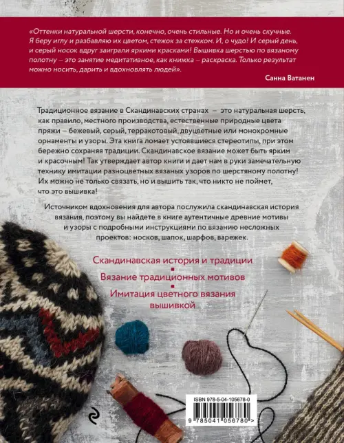 Эта необычная книга открывает перед читателем не только интересную технику имитации цветного вязания, но и ярко, красочно и эмоционально знакомит со скандинавскими вязальными традициями. Это и аутентичные узоры, мотивы и орнаменты, и благородно-нейтральные цвета пряжи, а самое главное — только натуральная овечья шерсть! В наш век пластика и синтетики все натуральное ценится на вес золота, но природа Скандинавии, как и наша, скуповата на яркие краски и солнечные лучи! Автор книги учит компенсировать дефицит ярких красок с помощью "раскрашивания" вязаной одежды и аксессуаров, виртуозно совмещая естественные спокойные оттенки натурального вязаного полотна с роскошными оттенками вышивки шерстью поверх традиционных скандинавских мотивов. Результат — не отличишь от настоящего жаккарда, который многим кажется слишком кропотливым и сложным. Раскрасить окружающий мир, одновременно получая удовольствие от процесса вязания и вышивки и восторг от результата — в этом миссия и цель книги. Вяжите с удовольствием!
