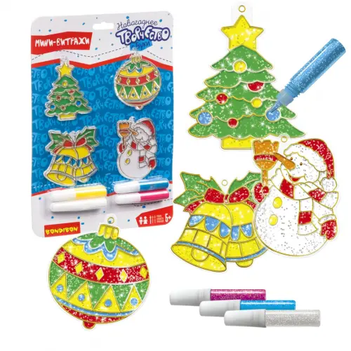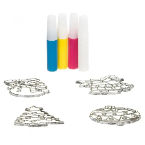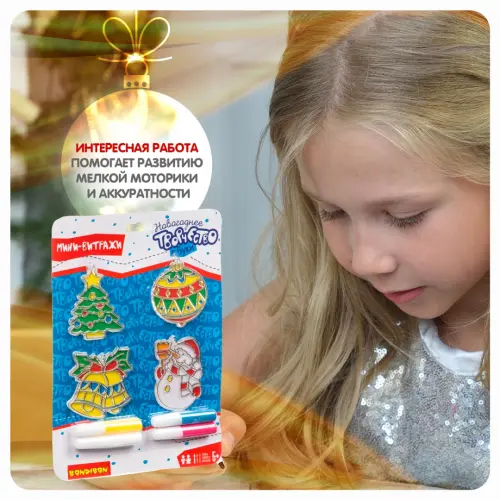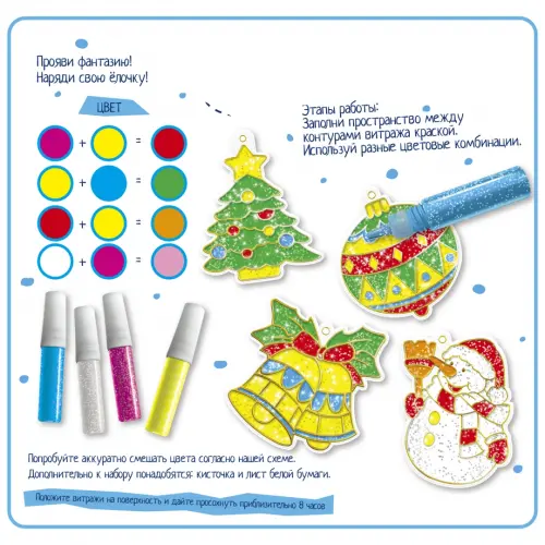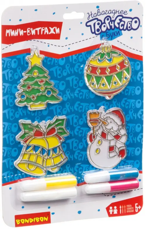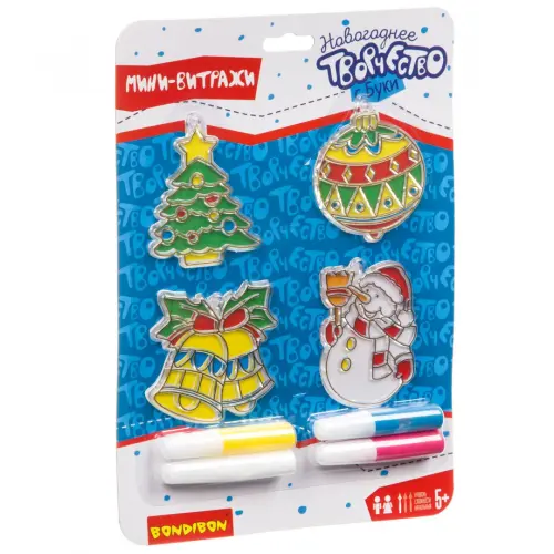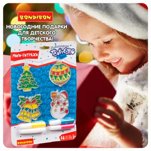 Витраж - это очень красивый вид искусства, который способен украсить собой любой интерьер. Изучить основы витражного искусства может даже ребенок, начиная с 5 лет. В наборе от Bondibon 4 тематических новогодних витража и 4 краски для раскрашивания. Готовые украшения в витражном стиле можно разместить на елке, окне, других предметах интерьера или порадовать близких рукодельным подарком.
